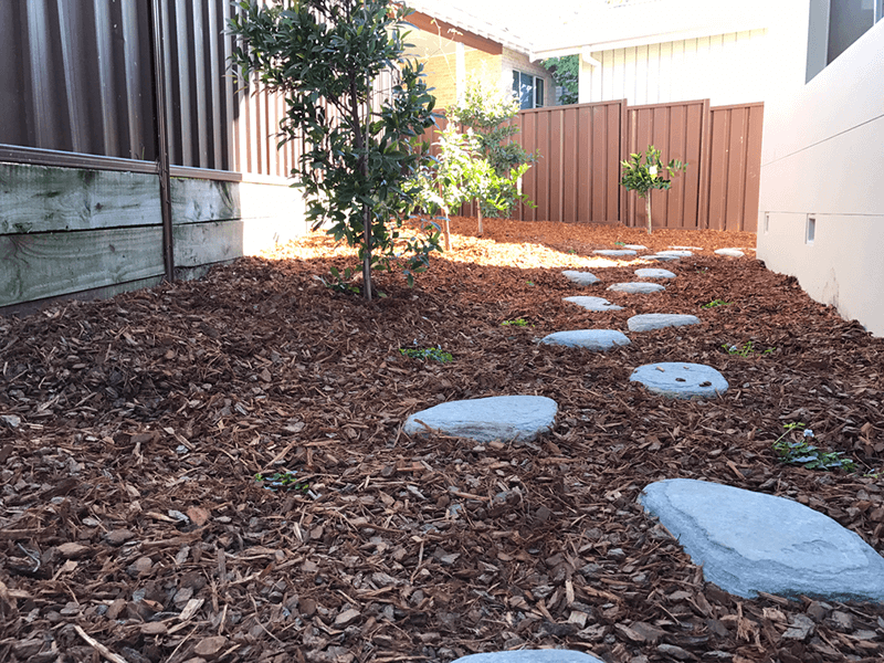 We were approached by this client to complete a full landscape package for their brand-new home. The driveway is sealed coloured concrete with a hand cove finish, we used blackbutt hardwood for the screening to match in with the decking around the pool and then we decided to use some sandstone cladding and sandstone edging to add a unique look to what would have been something otherwise quite basic. We used flagging stones as stepping stones through a native garden to create that country feel for an escape from reality.