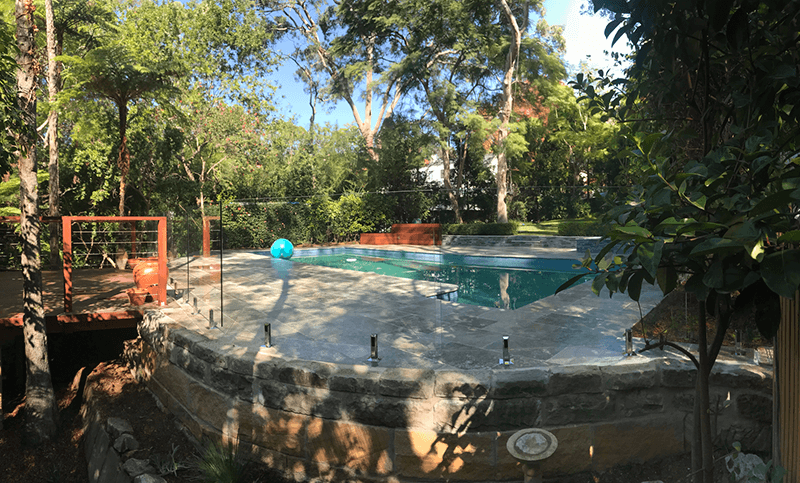 This particular client approached us with a desire to complete an entire makeover of there pool area and front courtyard. The job was completed in two stages, the first being the pool area and the second being the front courtyard a year later. Stage one was to refurbish an existing pool which had been neglected for several years. The paving ad sunk around the pool and the retaining walls had rotted and moved over time. The job consisted of man separate features including, paving a concrete slab around the pool, repairing the sandstone retaining walls, paving around the pool using silver travertine, installation of new stainless-steel strip drains, timber bench seating installed, glass pool fencing and a complete makeover of their garden area.