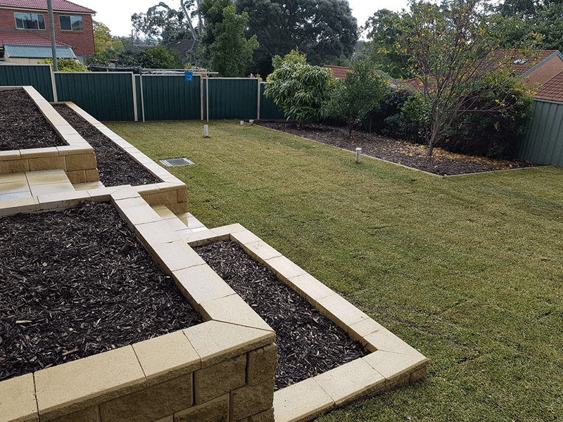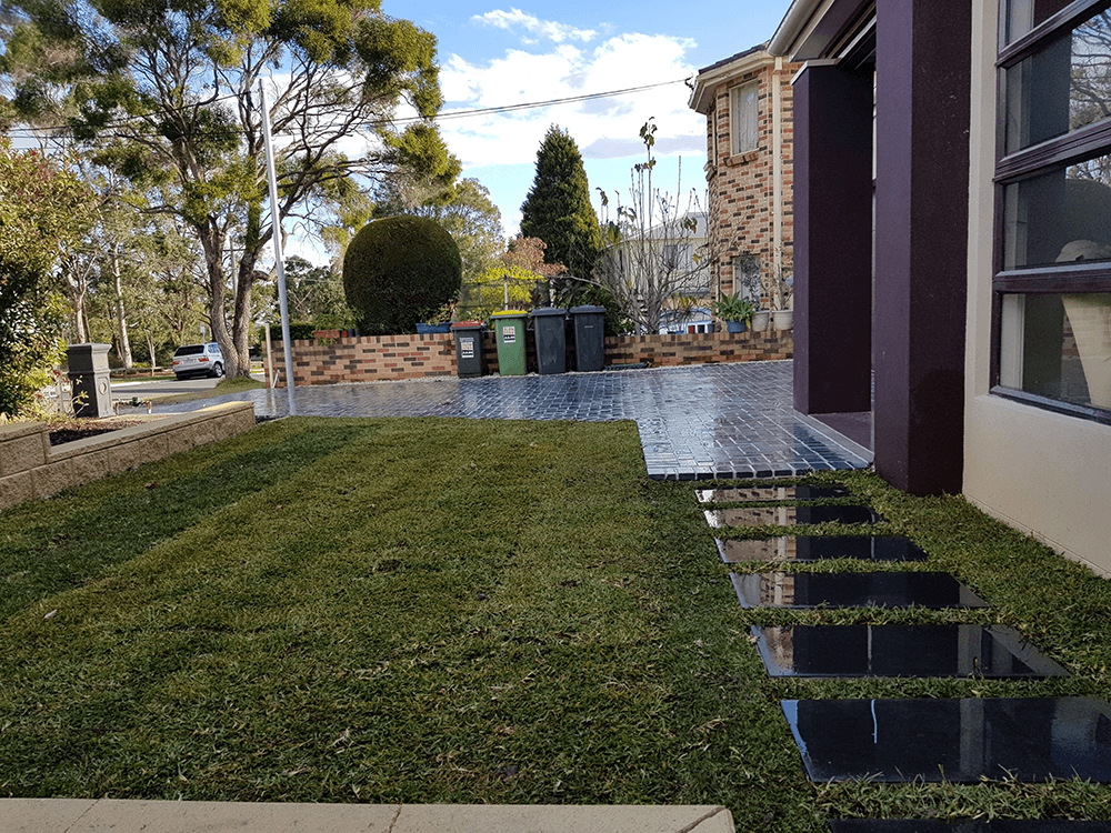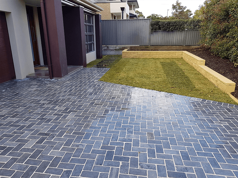 This client was after a whole landscape package with a difference. With that in mind, we suggested a unique bluestone driveway in a herringbone pattern. Other than the bluestone driveway, we also used bluestone slabs for the stepping stones. We then used concrete blocks for the retaining walls, concrete bricks for the edging, synthetic grass for a friendly, kids play area as well as the garden beds and turf to complete the job.