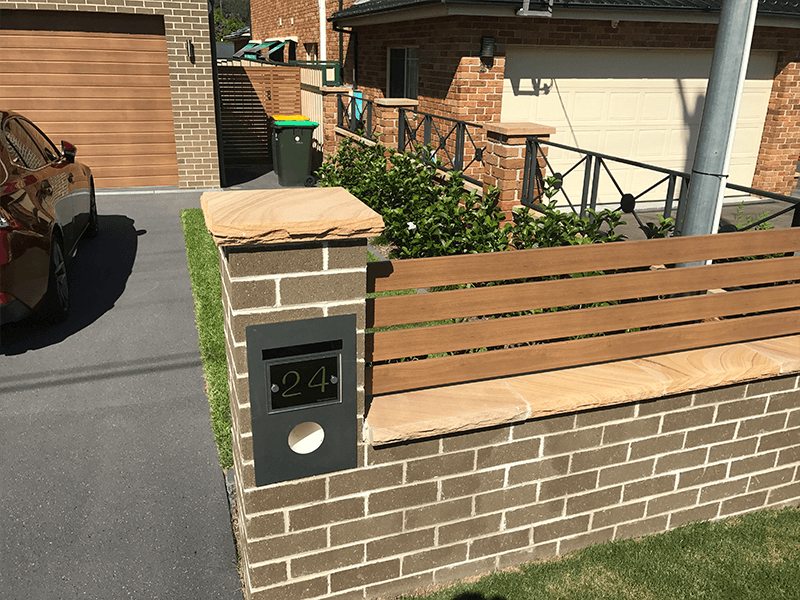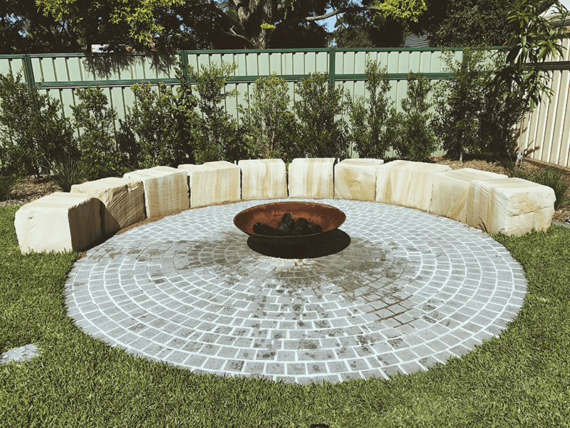 This particular client was after a whole landscape package with an emphasis on being low maintenance. This job consisted of multiple areas and features specific to what the client was after. We provided our clients with boundary retaining walls to level the entire back yard, we then constructed the front brick wall with sandstone capping and aluminium slats, a rock finish driveway, cobblestone seating area with rough sawn sandstone seating, a cast iron fire pit, aluminium screening, gates and decking, bluestone stepping stones, brick edging and a water feature. We also installed lighting, irrigation, garden beds and turfing.