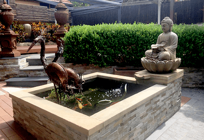 Our client approached us to give their existing garden a 'face lift'. This involved constructing a brand new deck using 140mm hardwood to create a more open feeling space, installing a water feature using bamboo and an oriental style pot with coy and creating a new Japanese style 'Zen Garden' using black and white decorative pebbles and bonsai plants along with 2 new coy ponds with a sandstone and bluestone finish.
