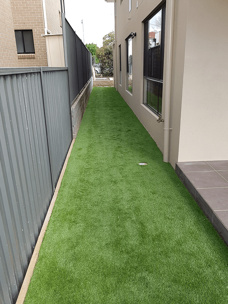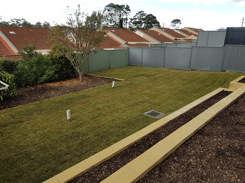 This client was after a whole landscape package with a difference. With that in mind, we suggested a unique bluestone driveway in a herringbone pattern. Other than the bluestone driveway, we also used bluestone slabs for the stepping stones. We then used concrete blocks for the retaining walls, concrete bricks for the edging, synthetic grass for a friendly, kids play area as well as the garden beds and turf to complete the job.