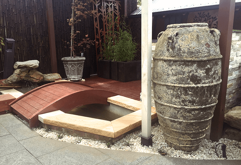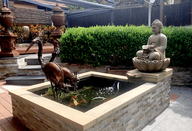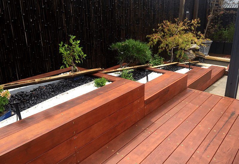 Our client approached us to give their existing garden a 'face lift'. This involved constructing a brand new deck using 140mm hardwood to create a more open feeling space, installing a water feature using bamboo and an oriental style pot with coy and creating a new Japanese style 'Zen Garden' using black and white decorative pebbles and bonsai plants along with 2 new coy ponds with a sandstone and bluestone finish.